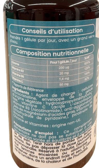 Ingrédients : Agent de charge : cellulose micro cristalline enveloppe de la géluled’origine végétale hydroxypropylmethyléne cellulose vitamine C ( acide L-ascorbique vitamine B 3 (nicotinamide )Chrome et Vitamines, origine non-UE.