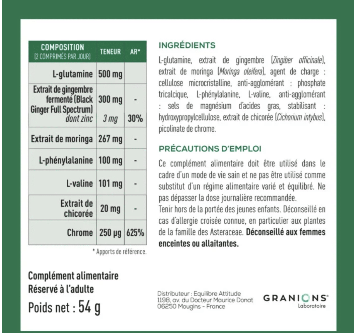 La L-phénylalanine et la L-valine : Ces acides aminés renforcent la cohérence de la formule. Ils complètent l’association des actifs dans une approche nutritionnelle globale orientée métabolisme, satiété et bien-être digestif.