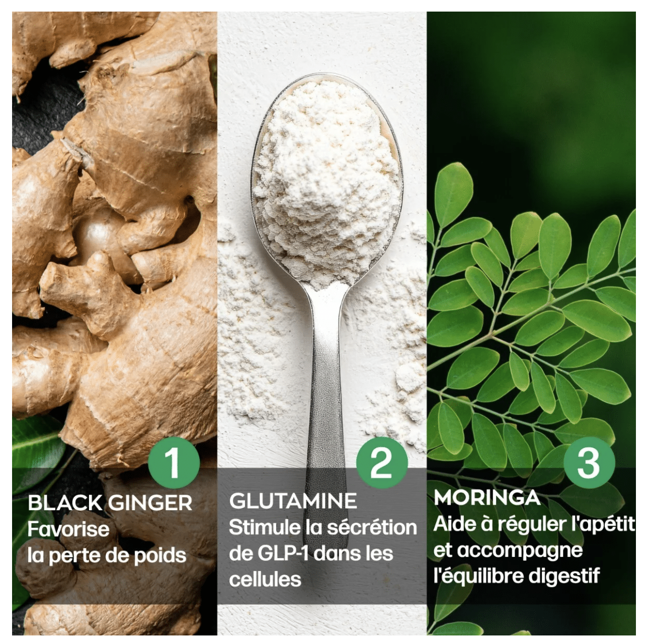 Le Black Ginger Full Spectrum : Cet extrait spécifique de gingembre fermenté se distingue par son spectre complet d’actifs du gingembre. Il a été sélectionné pour son intérêt dans l’accompagnement du contrôle du poids. Il soutient l’équilibre métabolique et s’intègre dans la formule comme actif différenciant.