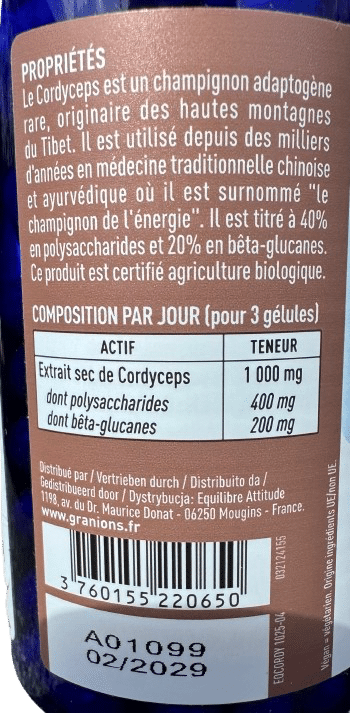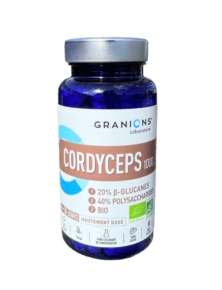 GRANIONS CORDYCEPS 1000 mg , Le cordyceps s’utilise tradionnellement pour son action tonifiante générale et le renforcement des défenses naturelles : lutte contre la fatigue, stimulation de l’action immunitaire et du tonus sexuel…