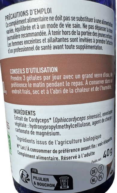 Extrait de Cordyceps* (Ophiocordyceps sinensis), envelope vegétale : hydroxypropylmethylcellulose, agent de charge:
