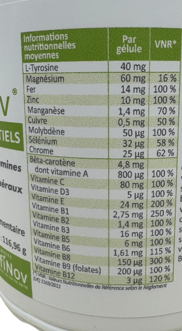 Oxyde de magnésium marin, gélule : gélatine de poisson, vitamines C et E, bisglycinate de fer, L-tyrosine, bisglycinate de zinc, bêta-carotène, picolinate de chrome, vitamine B9, vitamine B3, levure au sélénium, vitamine B8, bisglycinate de manganèse, vitamine B5, bisglycinate de cuivre, molybdate de sodium, anti-agglomérant : stéarate de magnésium, vitamine B1, vitamines B12,