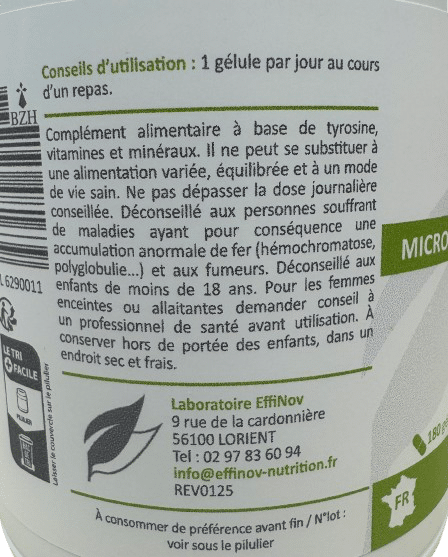 Ce complément alimentaire ne peut se substituer à une alimentation variée, équilibrée et à un mode de vie sain. Ne pas dépasser la dose journalière conseillée. A conserver hors de portée des enfants, dans un endroit sec et frais.