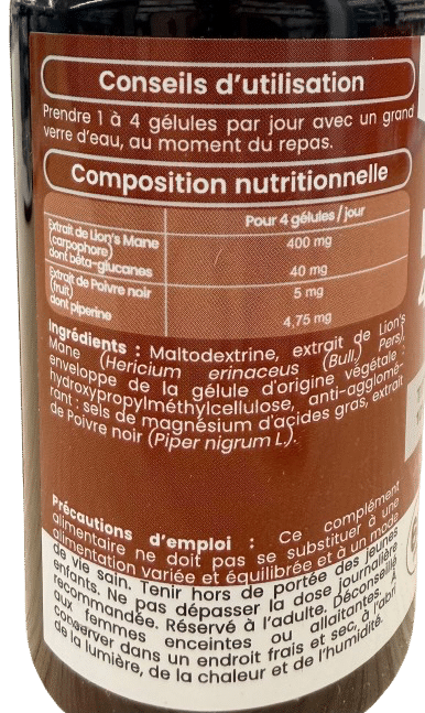 Exrat de Lion’s Mane. ,carpophore dont 400mg dont beta-clucane: 40 mg