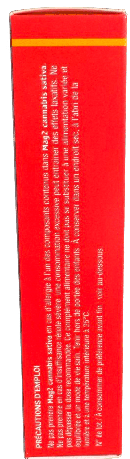 - Femmes enceintes et allaitantes, personnes sous contrôle médical : pas de contre-indication connue aux doses recommandées. Prendre l’avis d’un professionnel de santé avant la prise de tout complément alimentaire.o Ne pas prendre Mag2 Cannabis Sativa en cas d’allergie à l’un de ses composants.