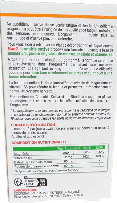 MAG 2 CANNABIS SATIVA pour vous aider à retrouver un état de relaxation et d’apaisement, grace une formule innovante à base de poudre de graines de chanvre et Rhodiola rosea.