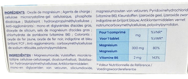Oxyde de magnésium, agents de charge : cellulose microcristalline-gel cellulosique, phosphate dicalcique, stabilisant : hydroxypropylmethylcellulose, anti-agglomérants : mono et di-glycérides d’acides gras, dioxyde de silicium [nano], sels de magnésium d’acides gras, chlorhydrate de pyridoxine (vitamine B6), colorants : oxyde de fer jaune, oxyde de fer noir, indigotine et bleu brillant, anti-agglomérants : carboxymethylcellulose de sodium réticulée, polyvinylpyrrolidone.