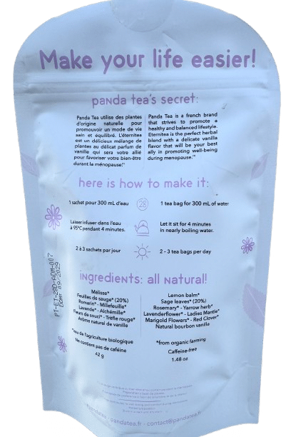 PANDA TEA ETERNITEA est une infusion bio spécialement pensée pour accompagner la ménopause avec douceur. Grâce à un mélange de plantes apaisantes et équilibrantes, elle aide à réduire les inconforts tels que les bouffées de chaleur et les sueurs nocturnes, tout en soutenant l’équilibre féminin.
