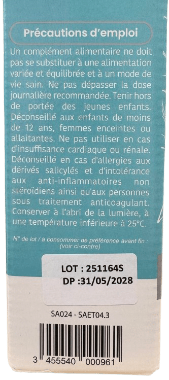 - 4.CONSERVATIONUn complément alimentaire ne doit pas de substituer à une alimentation variée et équilibrée et à un mode de vie sain. Ne pas dépasser la dose journalière recommandée. Tenir hors de portée des jeunes enfants. Déconseillé aux enfants, femmes enceintes ou qui allaitent. Déconseillé aux personnes souffrant d’allergie aux dérivés salicylés et chez les personnes sous traitement anti-coagulant. Conserver à l’abri de la lumière, à une température inférieure à 25°C.