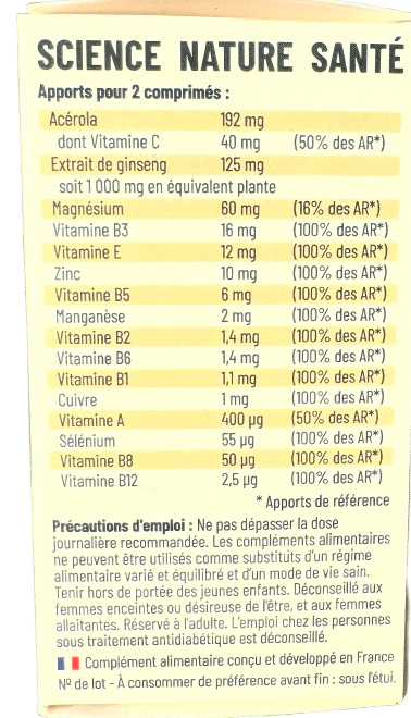 Complément alimentaire à base de vitamines, de minéraux et de ginseng.