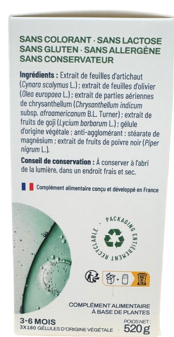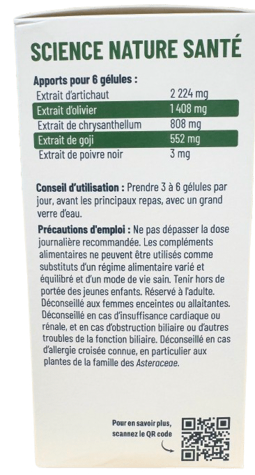 - Pour 6 gélules ,Extrait d’artichaut 2 224 mg ,Extrait d’olivier 1408 mg , Extrait de chrysanthellum 808 mg , Extrait de goji 552 mg